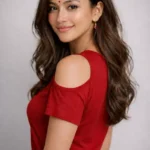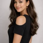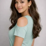 A young woman wearing a light blue crew neck t-shirt and black pants stands with her hands on her hips. She has a black bandana headband and is giving a playful wink against a plain gray background.