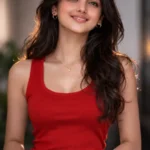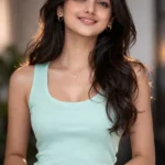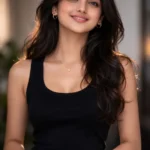 A young woman wearing a light blue crew neck t-shirt and black pants stands with her hands on her hips. She has a black bandana headband and is giving a playful wink against a plain gray background.